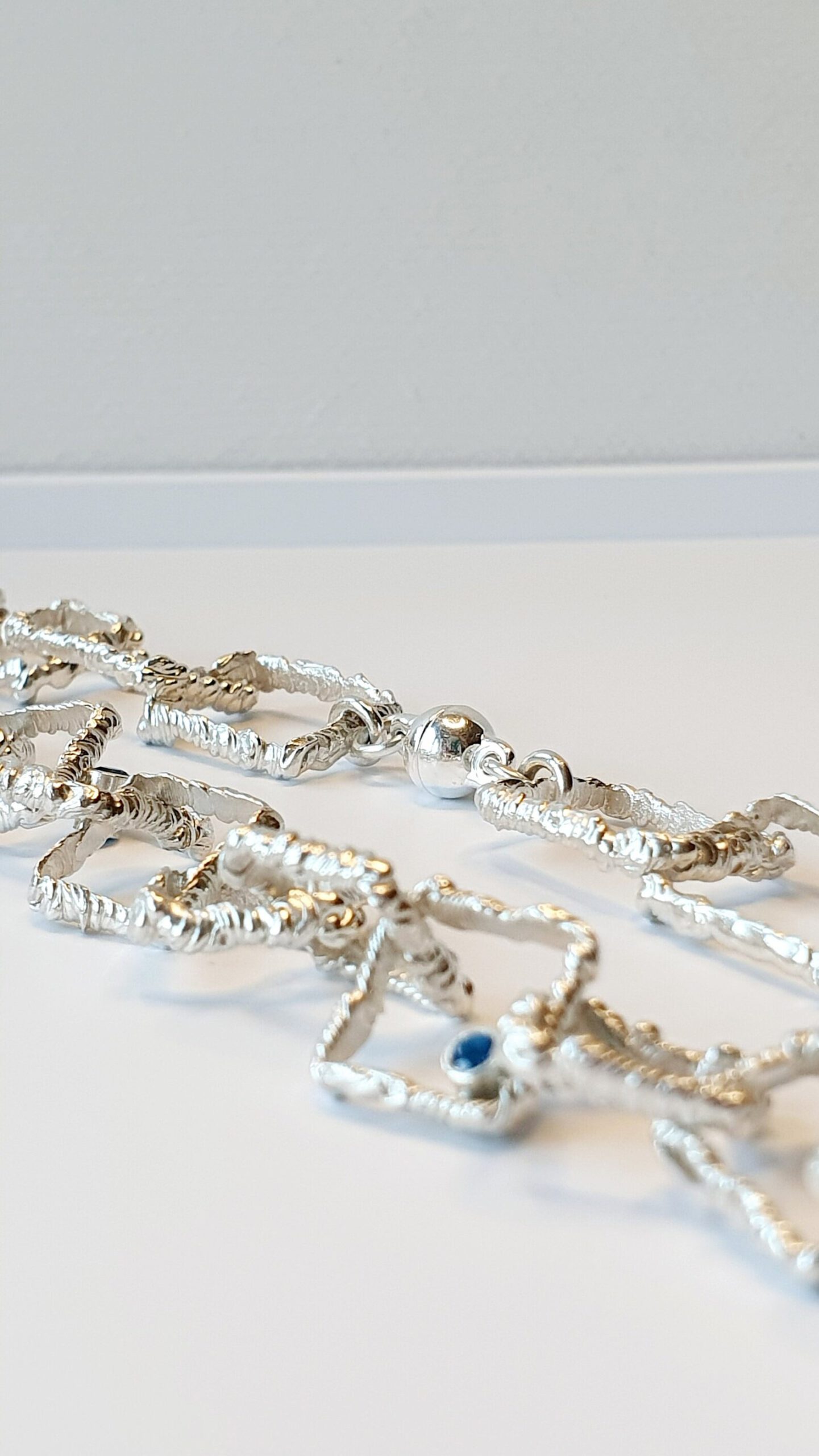 Die Kette besteht aus massiven, frei beweglichen Gliedern aus 925 Sterling Silber. 29 quadratische und 4 viereckige Endglieder bilden eine harmonische, klare Struktur. Das Besondere: Sechs Glieder sind mit insgesamt 12 Kaschmir Topasen (Ø 2,5 mm) besetzt, die zweiseitig gefasst wurden. Durch jede Bewegung fangen die Steine das Licht ein und verleihen der Kette ein faszinierendes Funkeln.